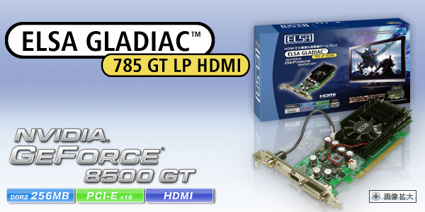 ELSA GLADIAC 785 GT LP HDMIは、NVIDIA最新のGPU NVIDIA GeForce 8500 GTグラフィックスプロセッサ、HDMI端子を搭載し、ロープロファイルデザインに対応したグラフィックスボードです。