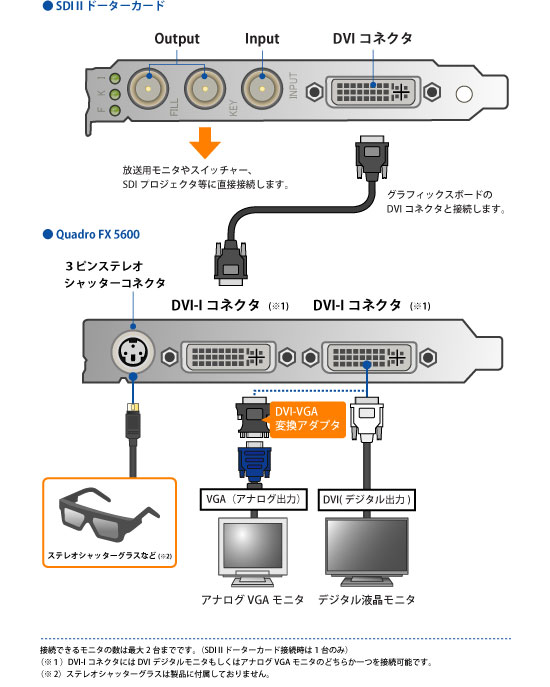 NVIDIA Quadro FX 5600 SDIは、ハイエンドワークステーション向けグラフィックスボードNVIDIA Quadro FX 5600と、SDI出力をサポートするNVIDIA SDIUオプションボードがセットになった、放送、ビデオ、フィルム分野向けのグラフィックスソリューションです。