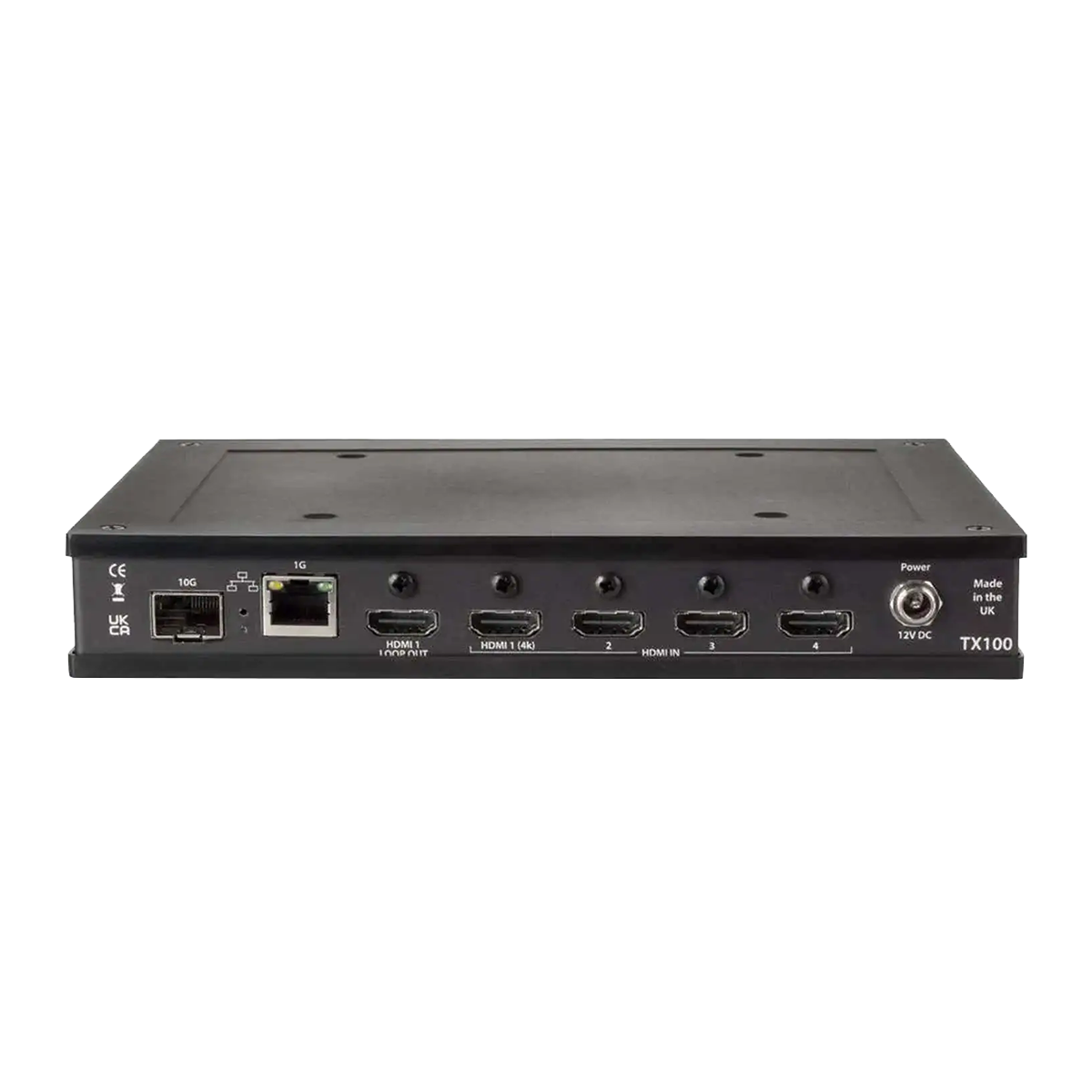 TX100は、1系統のHDMI 2.0入力と3系統のHDMI 1.4入力を備え、1系統の4Kストリーム、または4系統の独立したFHDストリームをサポートします。また、ループスルー機能を搭載しているため、ネットワーク配信に負荷をかけることなく、4Kワークステーションのローカルモニタリングが可能です。