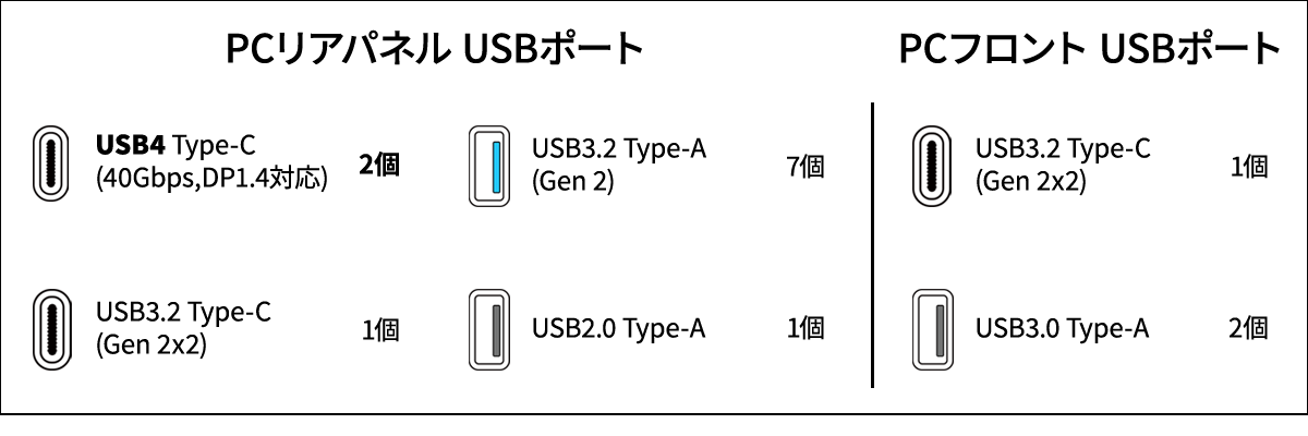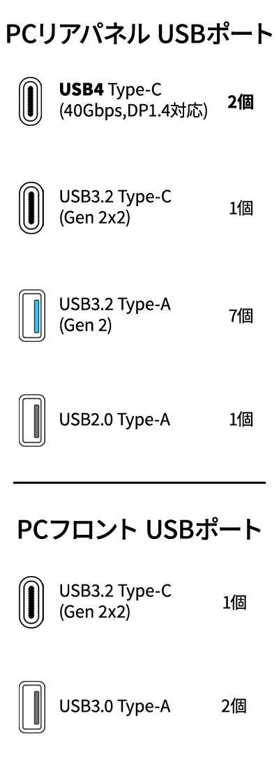 前面: USB 3.0 Type-A×2 / USB 3.2 Gen2 x2 Type-C ×1 マイク入力×1 / ヘッドフォン出力×1 背面: USB4 Type-C ポート×2 / USB 3.2 Gen2 Type-Aポート×1 / USB 3.1 Gen1 Type-A ポート×7 / USB 2.0 ポート ×1 アンテナポート×2 / HDMIポート×1 / DisplayPort( Input Only ) ×1 / RJ-45 LAN ポート×2(10G×1,2.5G×1) ライン出力ジャック×1 / マイク入力ジャック×1 / SPDIF 光出力コネクタ ポート×1 |