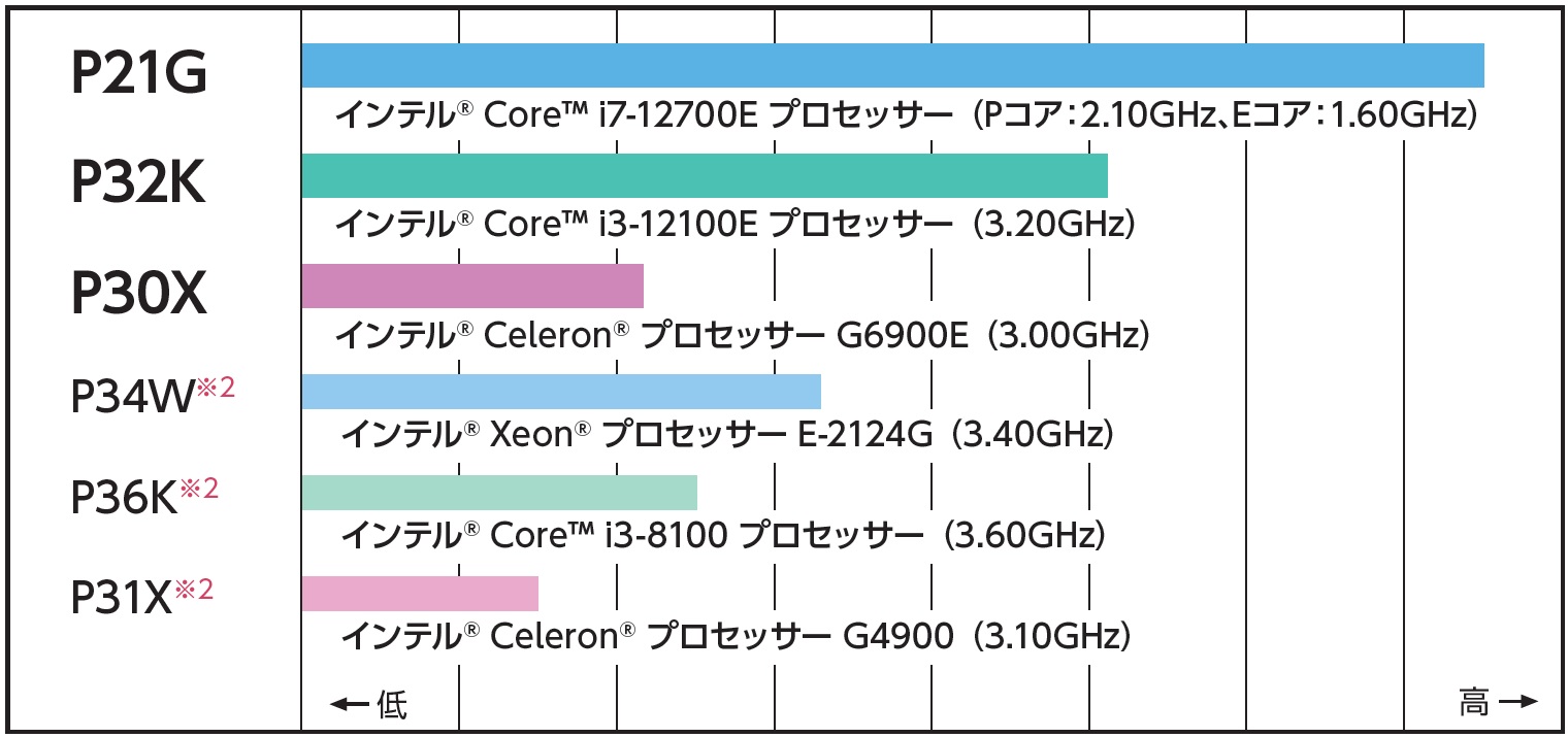 インテル® Core™ i7-12700E プロセッサー(Pコア:2.10GHz、Eコア:1.60GHz)を搭載。