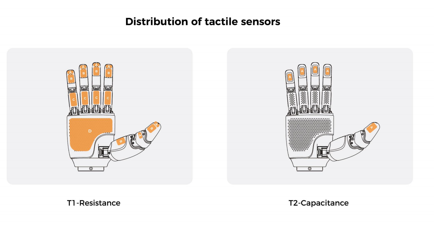 ・コンデンサー式触覚センサー(垂直と水平力の両方向感知対応)搭載バージョン:指先に搭載(全部で5個)