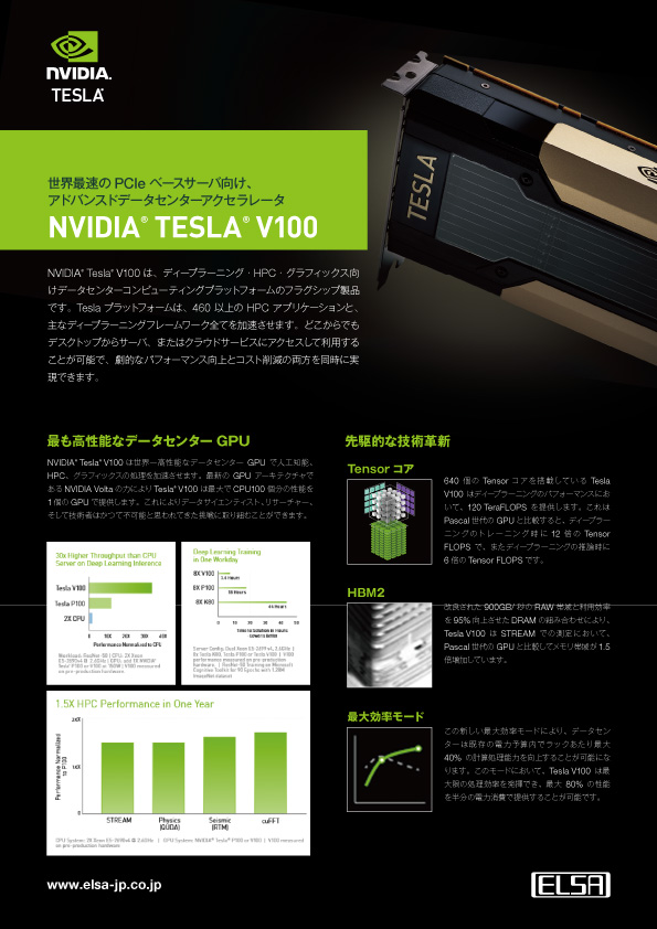 Tesla V100 / V100Sは、ディープラーニング・HPC・グラフィックス向けデータセンターコンピューティングプラットフォームのフラグシップ製品です。Teslaプラットフォームは、460以上のHPCアプリケーションと、主なディープラーニングフレームワーク全てを加速させます。どこからでもデスクトップからサーバ、またはクラウドサービスにアクセスして利用することが可能で、劇的なパフォーマンス向上とコスト削減の両方を同時に実現できます。