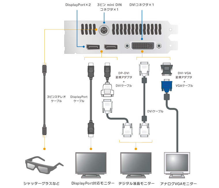 デュアルリンクに対応した1系統のDVIデジタル出力コネクタと、最新規格であるDisplayPortコネクタを2系統搭載。(*1)