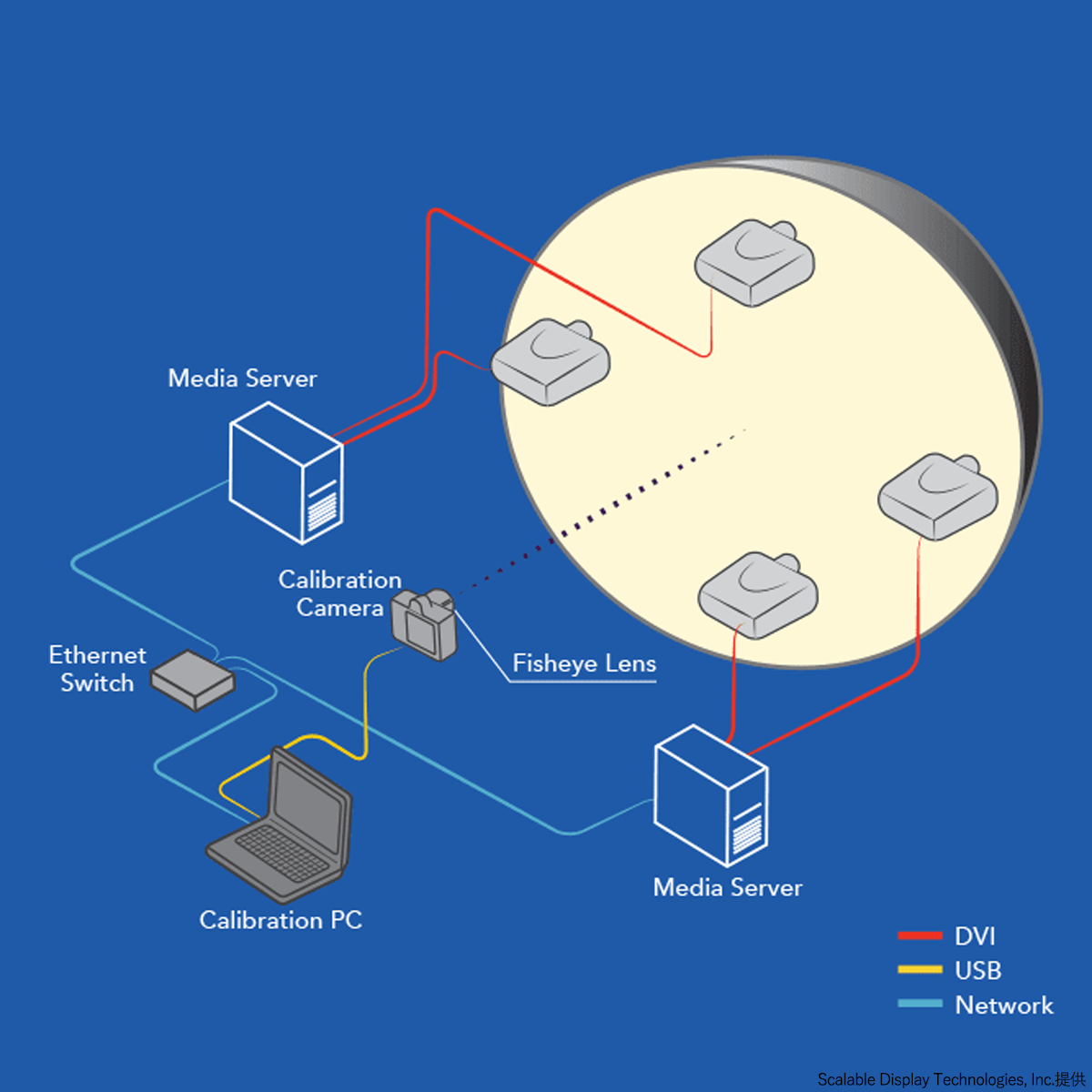 Scalable Display Maneger(SDM)は複数プロジェクター環境でのワープおよびブレンディングを演算によって処理し、演算結果を並列化したPCおよび複数のワープ用機器への分配を行うソフトウェアです。特許取得済のカメラフィードバック技術により、SDMは ピクセル完全なワープおよびブレンディングを演算し、その結果を Scalable Mesh Fileとして保存します。 SDMはワープおよびブレンディング機能を搭載したデバイスに対し、保存したScalable Mesh File のデータを供給します。
