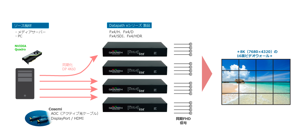 例)NVIDIA Quadro の 4系統出力をFX4 でさらに分割することで、FHD 16面による 8K 表示や